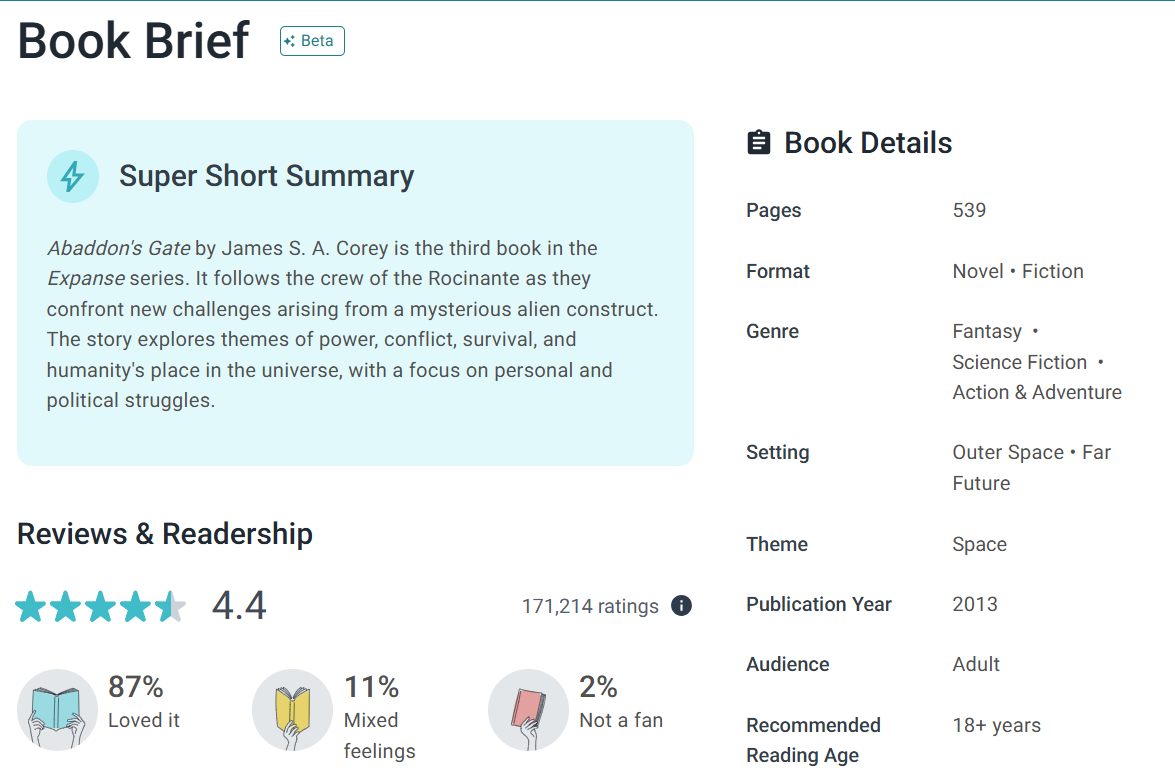 You can also explore thousands of Book Briefs without a subscription. Designed for easy browsing and discovery, each Book Brief provides a short, spoiler-free summary plus an at-a-glance snapshot of a book's mood, reviews and reception, reader profile, and other details to help you decide if a title is right for you.