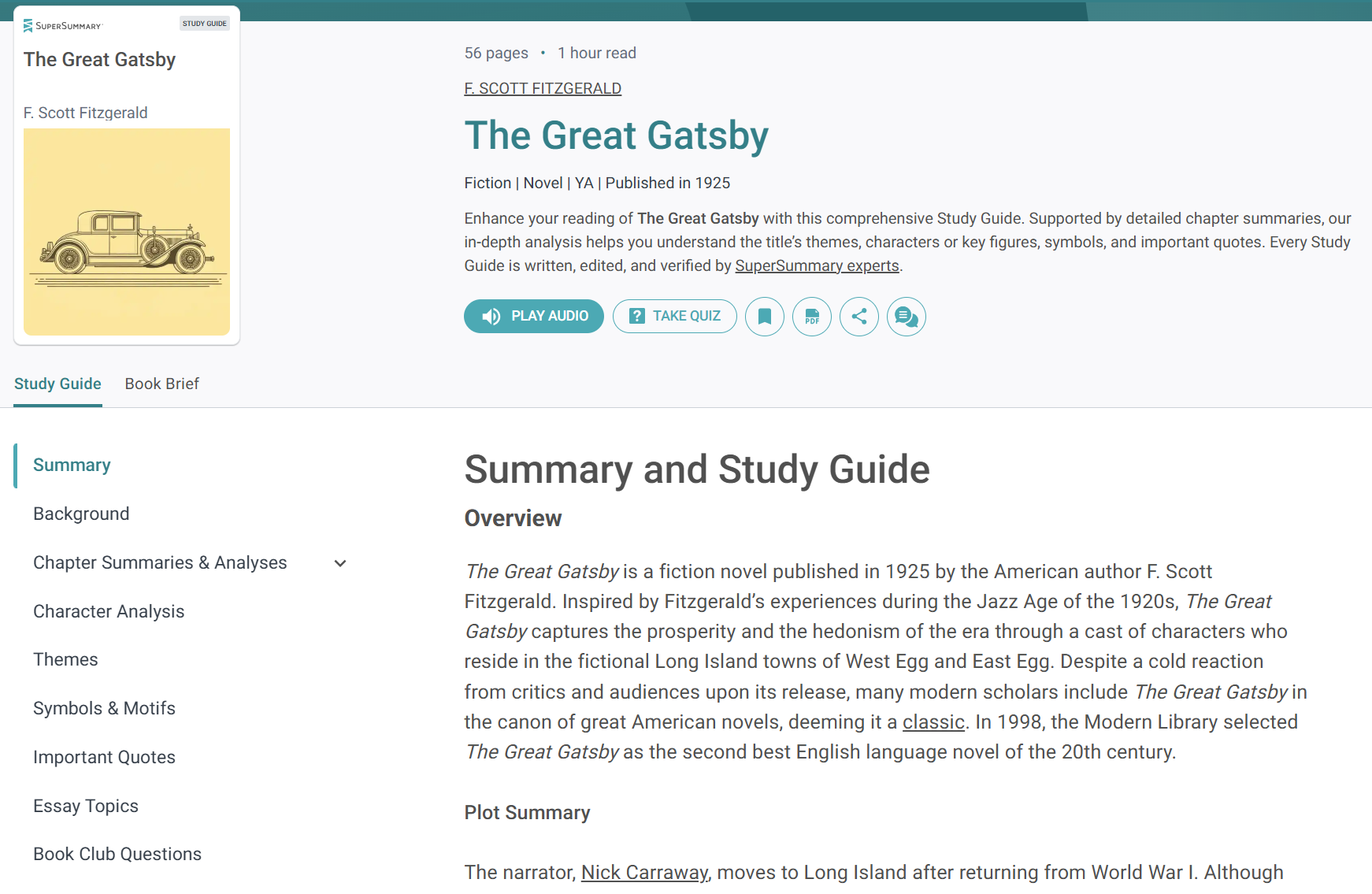 SuperSummary also offers a free preview of 9,550+ full-length Study Guides, featuring a complete plot summary as well as a snapshot of the rest of the Guide's content.