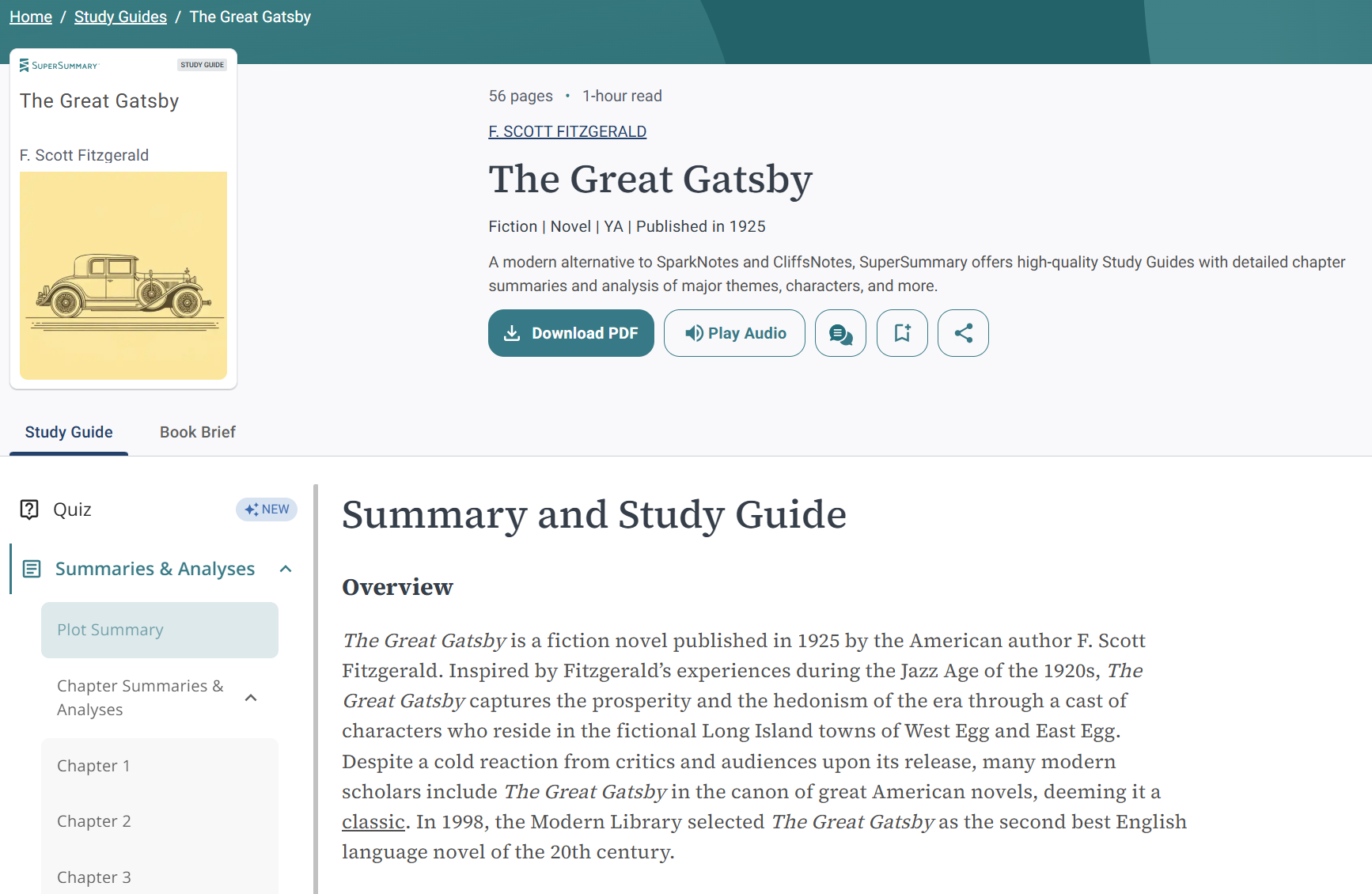 SuperSummary also offers a free preview of 10,200+ full-length Study Guides, featuring a complete plot summary as well as a snapshot of the rest of the Guide's content.