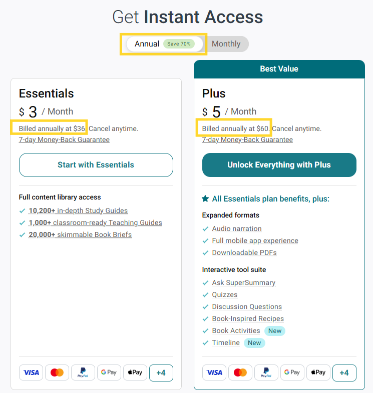 Yes, the annual plan is billed $36 (for the Essentials plan) or $60 (for the Plus plan) upfront, as shown on our Subscribe page. The $3 or $5 per month reflects the effective monthly cost when choosing the annual plan, offering significant savings compared to the $9.95 and $16.95 per month rates for the monthly plans.